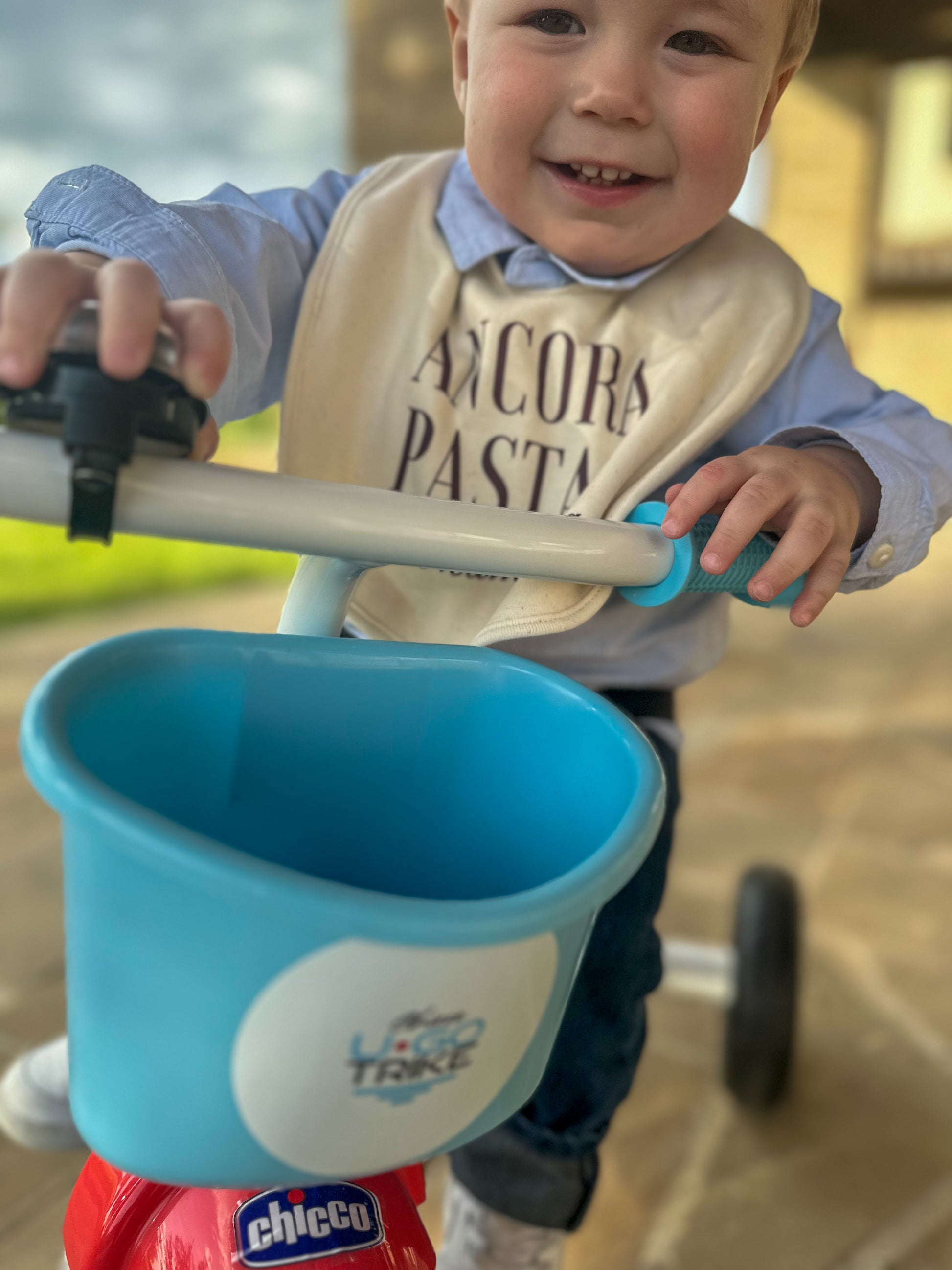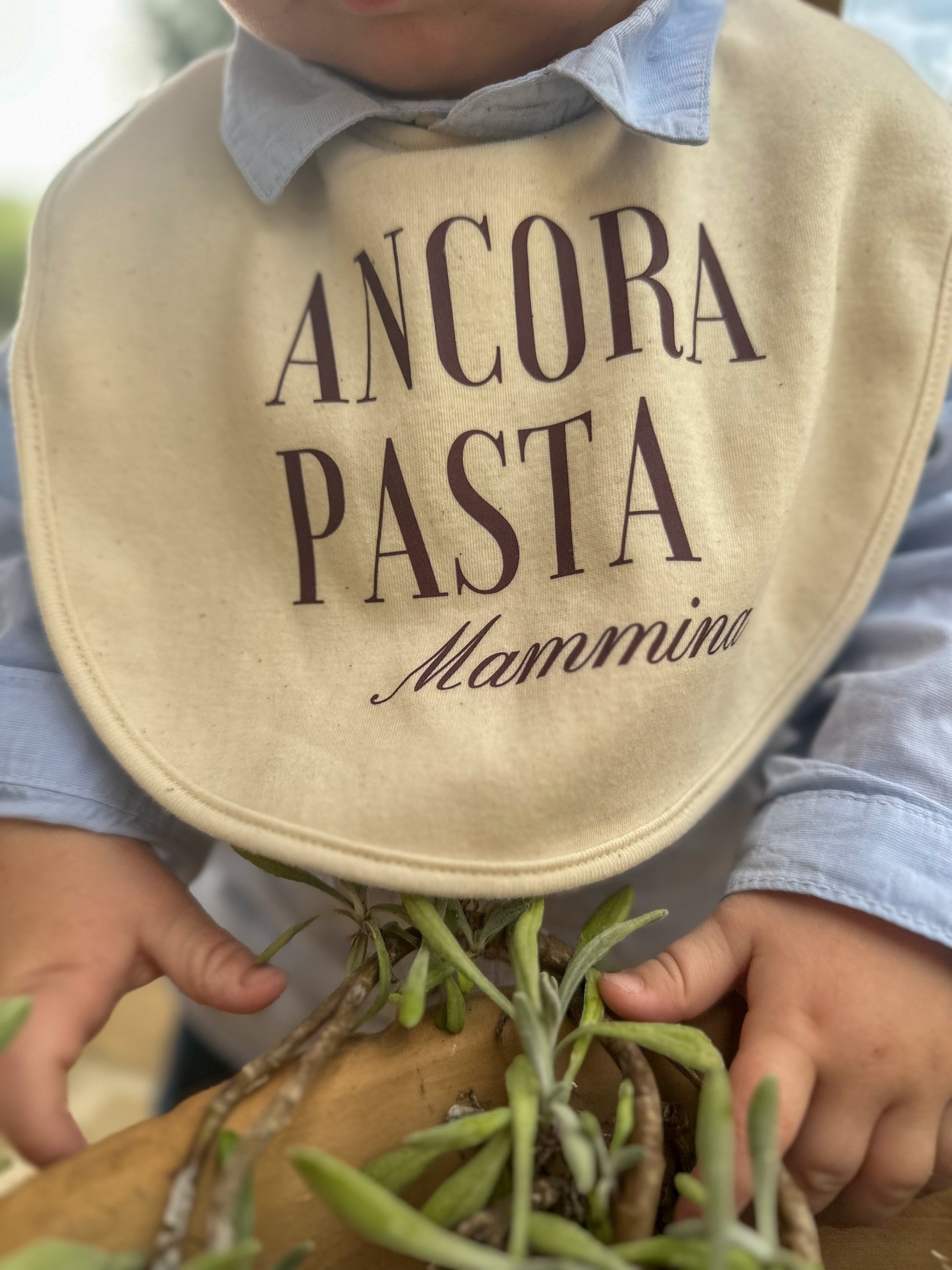 Ci sono occasioni in cui non vogliamo sfigurare! Per uscite eleganti, pranzi e cene al ristorante, addobbate i vostri figlioli con il più chic dei bavaglini, in morbido cotone biologico certificato con tessuto naturale. Adorabile e ironico, con scritta "Ancora Pasta" color cioccolato.