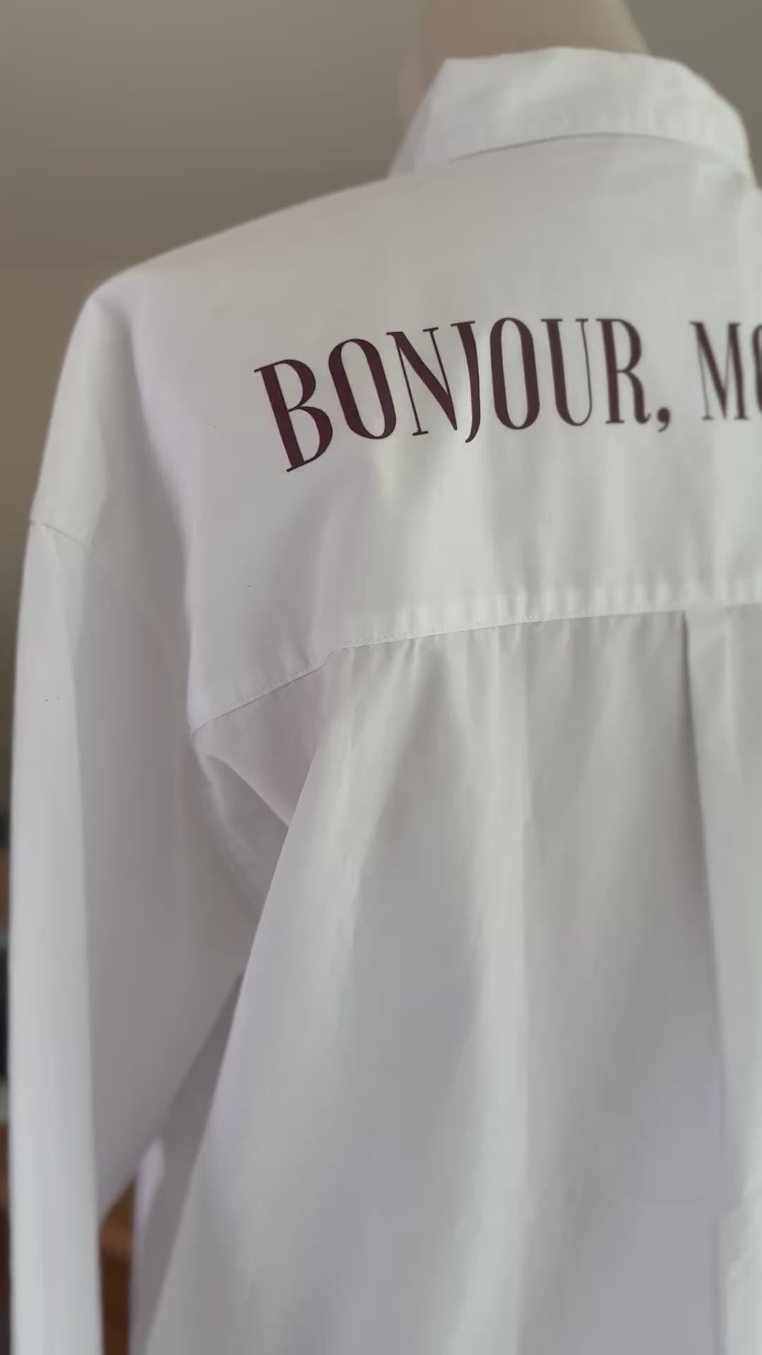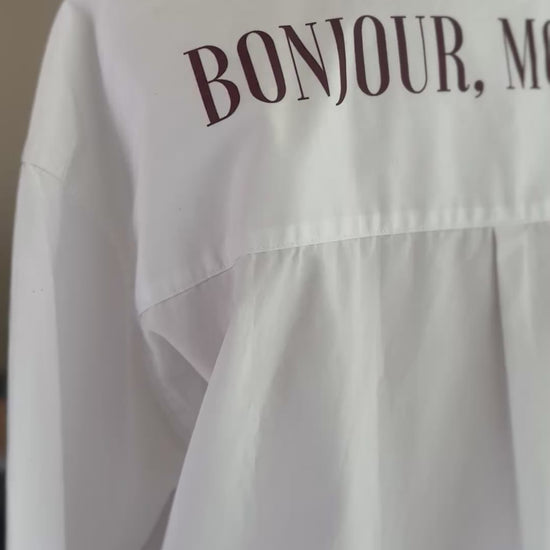 La stampa sulle spalle, in un elegante tono borgogna, recita con tenerezza: "Bonjour mon amour", come un abbraccio discreto, un pensiero che ti resta vicino ogni giorno.